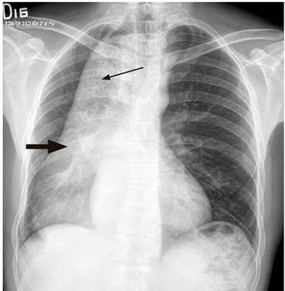 Figure 1 Chest x-ray, posteroanterior (PA) view. Mediastinal mass extending to the right and posterior to the mediastinum (thick arrow). Irregular air-fluid level and heterogeneous opacity content suggestive of food (thin arrow). Source: Gastroenterology Unit. Hospital Universitario San Ignacio. Bogotá D.C. Colombia.