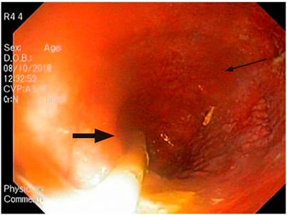 Figure 3 Esophagogastroduodenoscopy (upper GI endoscopy or EGD). Proximal esophagus with increased luminal caliber, nasogastric tube and undigested food remains (thick arrow). Congested mucosa with no stigmata of recent hemorrhage (thin arrow). Source: Gastroenterology Unit. Hospital Universitario San Ignacio. Bogotá D.C. Colombia.