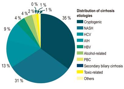 This study showed that NASH cirrhosis is the second most important cause of advanced chronic liver disease in our environment (30.9%), only below cryptogenic cirrhosis (35%) (Figure 1). However, it is worth noting that some of these patients could correspond to late-diagnosed NASH cirrhosis.
