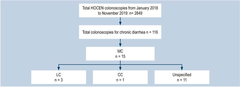 Retrospective study of patient cases in which the pathology results of biopsies taken from all patients who underwent colonoscopy for a diagnosis of chronic diarrhea for 22 months, between February 2018 and November 2019, were reviewed and whose histological results confirmed the diagnosis of MC. We reviewed the gastroenterology service database, the pathology reports, and the medical records of the patients included in the study.