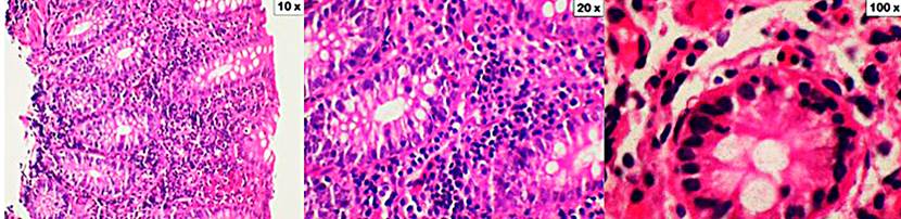 Figure 2 Lymphocytic colitis. The cuts show the mucosa of the colon distorted by a significant increase in intraepithelial lymphocytes (10x increase). In addition, there is a dense inflammatory infiltrate in the lamina propria consisting of lymphocytes, plasma cells, eosinophils, and occasional neutrophils (an increase of 20x and 100x). Coloration of hematoxylin and eosin (H&E).