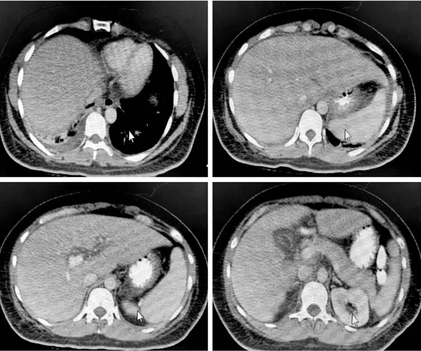 Figura 1 Tomografía axial computarizada (TAC) de abdomen de la paciente. Derrame pleural laminar derecho con atelectasias subsegmentarias. Esteatosis hepática difusa sin lesiones focales. Hallazgos descritos a nivel pancreático que sugieren proceso edematoso intersticial Balthazar C. Índice de gravedad 2. Imagen nodular hipodensa renal derecha compatible con quiste. Liquido laminar intraabdominal. Cortesía del departamento de radiología HUDN.