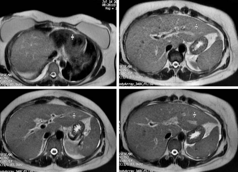 Figura 2 Colangiorresonancia de la paciente. Edema de las paredes de la vesícula y barro biliar en su interior sin observar cálculos en la luz vesicular ni en la vía biliar que originen obstrucción. Líquido libre en el espacio de Morrison y gotera parietocólica derecha. Líquido libre en la base pulmonar derecha. Hepatomegalia leve. Cortesía del departamento de radiología HUDN.
