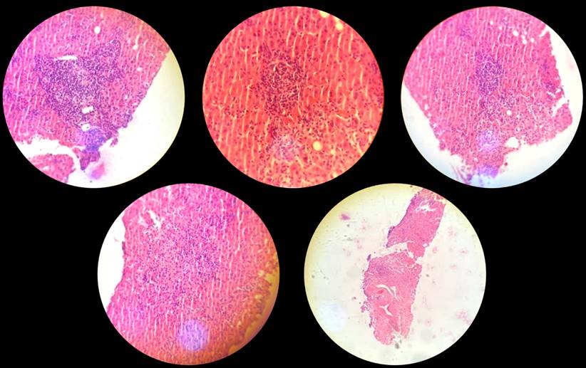 Finalmente, se realizó una biopsia hepática (Figura 3), cuyo diagnóstico histopatológico señaló un proceso inflamatorio de células de línea blanca compatible con un patrón de hepatitis aguda con necrosis pericentral y hepatocitos apoptóticos. Es de anotar que la evolución clínica de la paciente hacia la mejoría con total recuperación se evidencia secundaria a la suspensión de la medicación de nimesulida y del suplemento dietético, con controles de función hepática y transaminasas dentro de los parámetros normales a los 30 días posteriores al egreso; esto, en conjunto con la biopsia hepática, indica que el origen del proceso patológico fue el inducido por medicamentos.