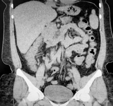 Figure 1 Tomographic findings. Thickening of the walls of the ascending colon with mucous enhancement (arrow). Source Authors’ archive.