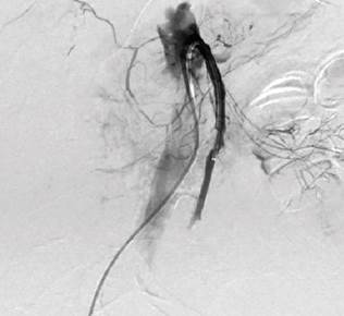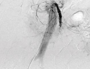 Figure 2 Selective arteriography of abdominal vessels denoting occlusion of the common hepatic, superior mesenteric, and inferior mesenteric arteries.