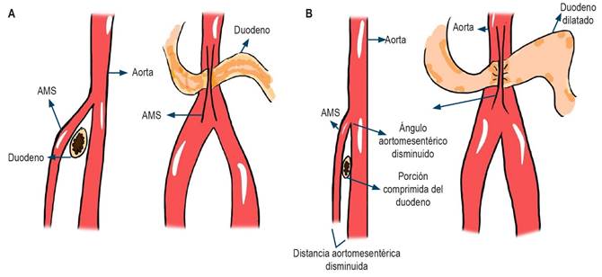 Figura 2 Mecanismo de compresión de la pinza aortomesentérica en el síndrome de Wilkie. A. Ilustración normal del espacio aortomesentérico. B. Compresión de la tercera porción del duodeno por un estrechamiento del ángulo aortomesentérico menor de 22°-25º. Distancia aortomesentérica menor de 10 mm. Dicha disminución conlleva a síntomas gastrointestinales crónicos. AMS: arteria mesentérica superior.