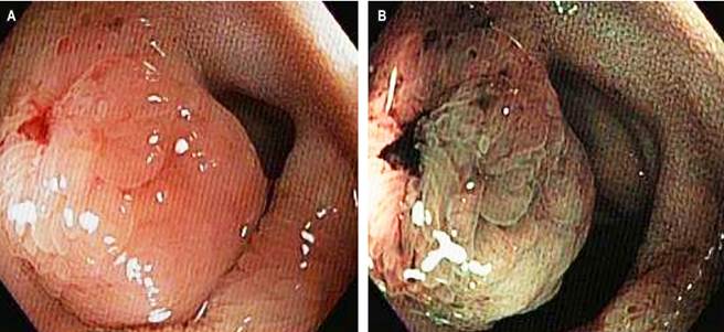Figure 1 Ileocolonoscopy. Sessile polypoid lesion (Paris classification: 0-Is) in the distal ileum. A. Image with white light. B. Image with digital chromoendoscopy. Images property of the authors.