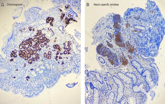Figure 2 Biopsy of the ileal sessile polypoid lesion. A. Positive chromogranin. B. Positive enolase. Images property of the authors.