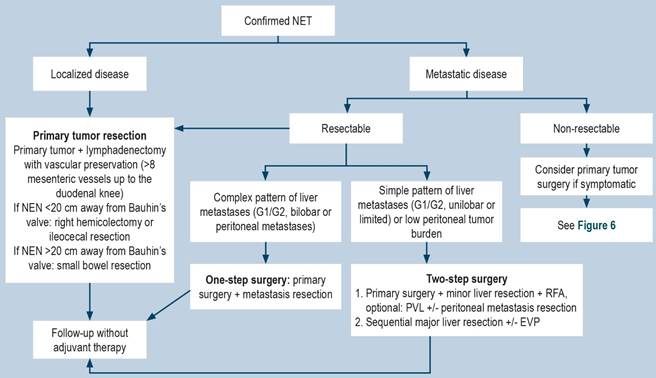 Figure 5 Treatment algorithm for SB-NETs. PVE: portal vein embolization; PVL: portal vein ligation; RFA: radiofrequency ablation. Adapted from: Oronsky B, et al. Neoplasia. 2017;19(12):991-10024.