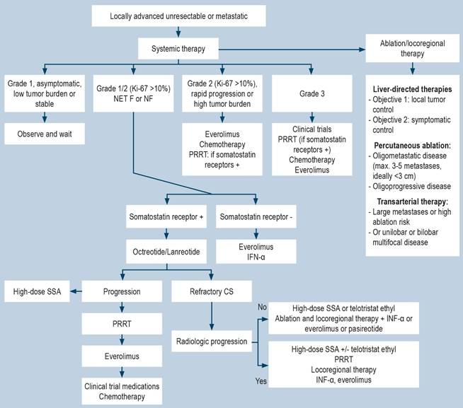 Figure 6 Treatment algorithm for SB-NETs. CS: carcinoid syndrome; PRRT: peptide receptor radionuclide therapy; SSA, somatostatin analogues. Adapted from: Oronsky B, et al. Neoplasia. 2017;19(12):991-10024.