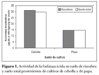 En las muestras de suelo correspondientes al cultivo de cebolla junca se observó una mayor actividad enzimática. Los valores de la enzima en estas muestras variaron entre 27,2 y 36,1 µg de p-nitrofenol por gramo de suelo para el total de las muestras, mientras que en las muestras del suelo con cultivo de papa se obtuvieron valores entre 8,7 y 20,6 µg de p-nitrofenol por gramo de suelo. En ninguno de los casos se presentó una diferencia significativa de la actividad de la fosfatasa ácida entre las muestras de rizosfera y de suelo total (figura 1).