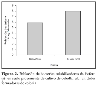 Sin embargo, paradójicamente la disponibilidad de P en el cultivo de cebolla es muy baja, según los datos obtenidos mediante el análisis fisicoquímico del suelo (tabla 1). Al parecer, aunque no existe reducción en la población de SP, la disponibilidad de estos microorganismos no es tan buena como se esperaría; probablemente existen otros factores que pueden estar afectando la actividad de estas bacterias y, por lo tanto, la disponibilidad del P en esos suelos, tal como el grado de eficiencia en la capacidad solubilizadora de la cepas.