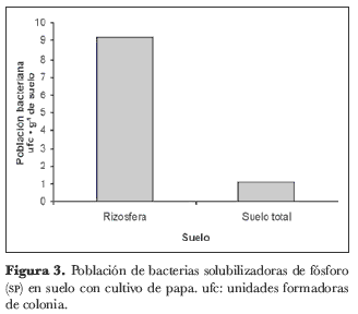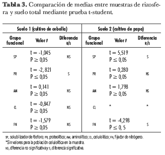 Con el fin de determinar la existencia de diferencias significativas en el número de ufc entre las muestras de rizosfera y suelo total para cada grupo funcional, incluyendo las bacterias SP, se realizó una prueba t-student para comparación de medias. Tal como se observa en la tabla 3, esta prueba determinó que sólo para las bacterias PR en muestra de cultivo de cebolla, las bacterias SP en cultivo de papa y las FN en cultivo de papa existen diferencias estadísticamente significativas entre muestras de rizosfera y suelo total.
