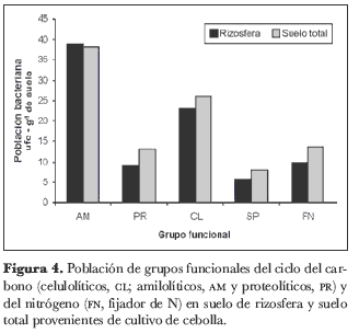 Se encontró un mayor número de ufc en el suelo correspondiente al cultivo de cebolla, posiblemente asociado a un aumento en el pH y la disponibilidad de nutrientes del suelo por aplicación de fertilizantes. Las bacterias SP no se encontraron en menor proporción que los grupos funcionales del ciclo del C y mantuvieron tamaños poblacionales similares a las bacterias FN, tanto en rizósfera como en suelo total en los suelos de ambos cultivos. Según los resultados obtenidos, en estos suelos agrícolas la diferencia en la proporción de microorganismos entre rizosfera y el suelo circundante podría variar por la disponibilidad de nutrientes determinada por la adición de fertilizantes.