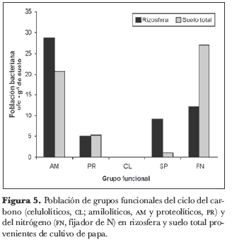 En la rizosfera del cultivo de cebolla junca, los grupos funcionales del ciclo del C presentaron un mayor número de ufc que las bacterias SP y las FN. La población de amilolíticos (AM) varió entre 20,5 y 83,5 · 103 ufc· g-1 de suelo, los proteolíticos (PR) entre 4,5 y 15,5· 103 ufc· g-1 de suelo y los celulolíticos (CL) entre 11,5 y 46· 103 ufc· g-1 de suelo (figura 4). En las muestras de suelo total, las bacterias de los grupos funcionales del ciclo del C siguieron presentando valores de ufc más altos que las FN y las SP. En las muestras de la rizosfera de papa, el grupo de bacterias con mayor número de ufc fueron las AM, seguidas de las poblaciones PR y de las bacterias FN (figura 5). Para las muestras de suelo, la abundancia bacteriana fue más alta para el grupo de AM, seguidas de las PR y las FN.