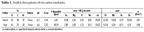 El análisis fisicoquímico de los suelos se realizó en el laboratorio de suelos de la Escuela de Agronomía de la UPTC, sede Tunja, utilizando para: textura, el método de Bouyoucos; pH, la relación 1:1 suelo:agua; acidez intercambiable, con KCL 1N; porcentaje de materia orgánica (MO), según Walkley-Black; conductividad eléctrica (CE), por extracto de saturación y conductivímetro; fósforo disponible, por el método de Bray II por colorimetría; Ca, Mg, K y Na, por extracción con NH4 Ac y absorción atómica; Fe, Mn, Cu y Zn, por extracción con DTPPA (siglas en inglés de ácido dietilen triamin pentametilenfosfónico) y absorción atómica; B, con agua caliente y S, con fosfato monocálcico (tabla 1).