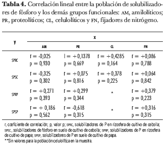 El crecimiento vegetal está directamente relacionado con las comunidades de grupos funcionales, porque diversas etapas de los ciclos de los nutrientes son mediadas exclusivamente por microorganismos, y algunos de éstos pueden participar en uno o más ciclos biogeoquímicos (Matsumoto et al., 2004). Según esto, el recuento de bacterias y las relaciones encontradas entre SP y los demás grupos funcionales en estos suelos podrían indicar el uso de bacterias SP como alternativa para suplir la deficiencia de P en los suelos agrícolas. Las relaciones negativas encontradas, aunque no son estadísticamente significativas, muestran una posible relación de competencia entre estos grupos bacterianos (tabla 4).