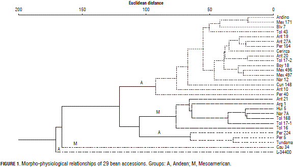 There was a notable, large group of 17 cultivars of an Andean origin in the products of the morphological and physiological ratios, coming from Colombia, Peru, and Bolivia; along with a group of seven materials that represented the Mesoamerican group that came from Colombia and Argentina; and a third group of the northern Andes with an origin center in Peru, integrated by Peru 224, Peru 5 and Tundama with one of their progenitors: Peru 5; with Cauca 34 and L-34400, with growth habits III and I, respectively, far from the other cultivar groups due to their physiological behavior.
