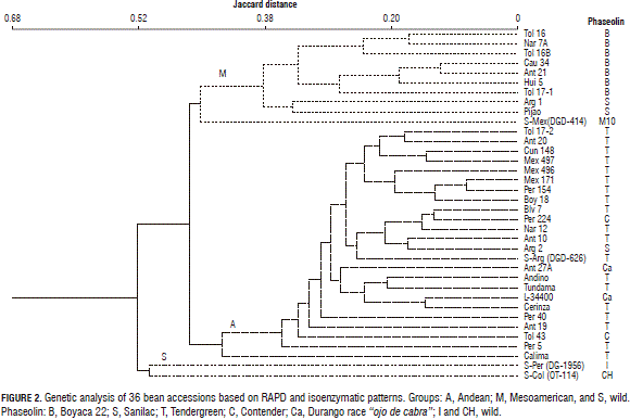 In plotting the relationships between the accessions in Fig. 2, two dissimilar groups were visualized due to their genetic grouping: the first group contained 10 Mesoamerican accessions, including two controls: Pijao, which is a cultivated bean typical of this group with S phaseolin and the M type of Central America; and one was the wild accession of Mexico (DGD-414) with phaseolin M10, characteristic of some wild Mesoamerican accessions. The cultivated accessions of this group came from Colombia and Argentina and are characterized by their small, red and cream colored seeds. The second group was composed of 24 cultivars, two of which were from the southern Andes of Argentina (one is cultivated and presented S type phaseolin and Andean morphological patterns; the other one was wild with T phaseolin). The other materials are cultivated in the northern Andes, include the Calima control, representative of the Nueva Granada race, and are characterized by large, red, cream, and cream-speckled red colored seeds and T, C, and Ca type phaseolins.