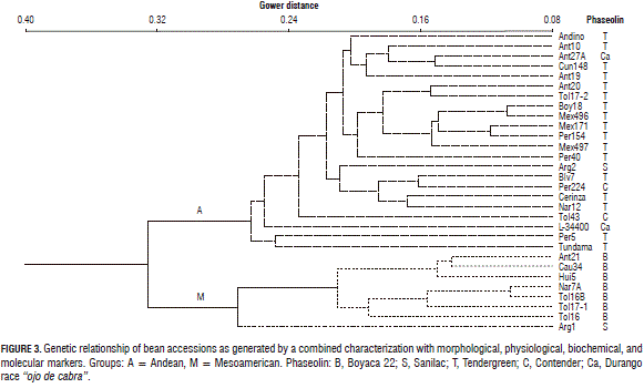 For the bean, the first studies on genetic diversity defined two genetic groups in terms of a simple locus that corresponded to phaseolin (Gepts et al., 1986). Later, the isoenzymatic data demonstrated that the separation between the groups is not limited to a simple locus or region of chromosomes, but that there are differences between those of Central America and those of the Andes with respect to morpho-agronomic, adaptation, and disease resistance characteristics (Singh et al., 1991a, Ligarreto and Ocampo, 2012). However, as physiological and morphological characteristics are expressed phenotyipcally, the accessions can be similar in these characteristics but different in their genomes and can also present dissimilarity in the phenotypic characteristics and have genetic nearness, as in the cultivars with growth habit I that can be seen in the two genetic groups (Cole-Rodgers et al., 1997).