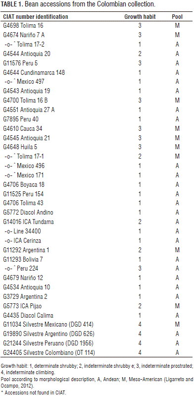 This study included 29 cultivated common bean accessions, of which four corresponded to improved varieties such as Diacol Andino, ICA Tundama, ICA Cerinza and L-34400; two controls: Diacol Calima (Nueva Granada race) and ICA Pijao (Mesoamerican race), four wild ones and the uncultivated Argentina 2 (Tab. 1). Different numbers of accession were used due to the need to include different accessions as reference patterns per characterization. The accessions form part of the germplasm that is administered by the Corporación Colombiana de Investigación Agropecuaria-Corpoica, located at the Tibaitata Research Center (Mosquera, Colombia) and were randomly selected from this collection of 165 shrub-type and 110 semi-climbing type accessions.