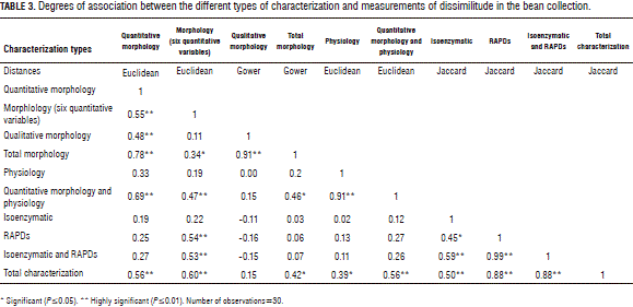 In the analysis of the association between the analog matrices of the distances of the different characterization modulations of the bean collection, the correlation coefficient (r) started to be significant when it was equal to or greater than 0.34 and highly significant at r=0.46 (Tab. 3). There was high association between the total morphological characterization with the qualitative morphological characterization r=0.91, measured with Gower distance; the physiological evaluation with the evaluation together with the physiological and quantitative morphological variables (r=0.91), in units of Euclidean distance; the characterization of isoenzymatic markers together with RAPD, with respect to just RAPD markers (r=0.99), compared by Jaccard distance; and the characterization of all the studied markers with respect to the RAPD markers and the RAPD and the isoenzymatic markers r=0.88, quantified by Gower distance.
