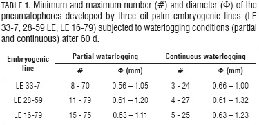 The soil water conditions had a significant effect on the physiological response of the oil palm clones. The plants developed a series of epigeous roots with a negative geotropism that grew above the water level, called pneumatophores (Fig. 2), as well as wide intercellular spaces or aerenchyma in these structures and the submerged roots as tolerance mechanisms against the continuous and partial waterlogging (Fig. 3). Pneumatophores began to appear approximately 15 d after starting the treatments in plants under waterlogged soil conditions and some days later in plants that were not subjected to permanent waterlogging. Thirty days after starting the treatments, 86 and 78% of the plants under continuous and partial waterlogging, respectively, formed pneumatophores, while at the end of the evaluation period (60 d after starting the treatments), all of the plants growing under waterlogged conditions developed these structures. Most of the pneumatophores under partially waterlogged conditions were very superficial, while those developed under permanently waterlogged conditions were longer and easier to count and measure. The plants kept permanently under waterlogged conditions formed between 8 and 79 pneumatophores, with a maximum diameter of 1.2 mm, while plants that were not subjected to permanent waterlogging showed fewer pneumatophores, with diameters (of the longer ones) not exceeding 1.3 mm (Tab. 1). These structures grew on the primary roots, their color varied from white to cream, and they were composed of two parts: the apical part and a body part with the presence of lenticels or openings that facilitated the entry and diffusion of oxygen to the waterlogged root system (Fig. 2).