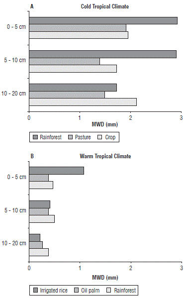 For the soil in a warm climate, the MWD can help to confirm the low structural stability of the soil. When such soils are irrigated for rice cultivation, the surface layer (0 to 5 cm) presents the largest MWD of this soil with a value of 1.08 mm. All the remaining values are equal or under 0.50 mm, which is very negative and confirms the general worse behavior of the aggregate stability in the three soils use systems in a warm climate (Fig. 3).