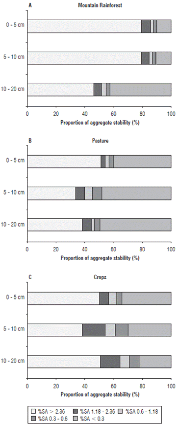 The lack of a significant statistical effect of the soil use system in most of the size classes of SA may be interpreted as a situation generated by the extremes on TOC, POC and MBOC observed in the evaluated soils. The soil in cold climate has very positive conditions of structure and aggregate stability, where the SA>2.36 mm prevails. Hence, none of the three evaluated use systems affects significantly this good condition. In contrast, it was found that the soil in a warm climate has very negative conditions of structure and aggregate stability, where the SA<0.30 mm prevails, and, therefore, none of the three evaluated uses affects significantly this negative condition.