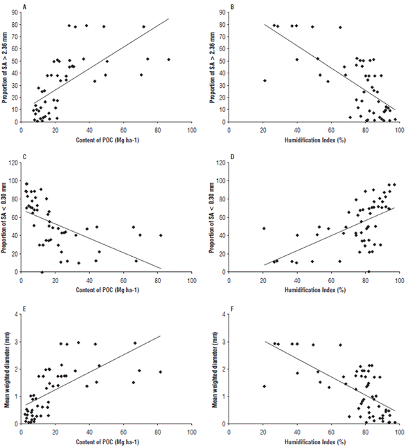 From the comparison functions of variable pairs (Fig. 4), the most relevant correlations are evident, and this helps to understand the relationship between structural stability and the SOC. The MWD and the SA>2.36 mm increase linearly when there is a higher POC, but they decrease when the humification index increases. For the SA<0.30 mm, a linear decrease can be observed when there is a higher content of POC, but an increase can be observed when there is a higher humification index. Similar results were obtained by Tivet et al. (2013) who found a positive relationship between the particulate OC with an increase of the SA of larger sizes.