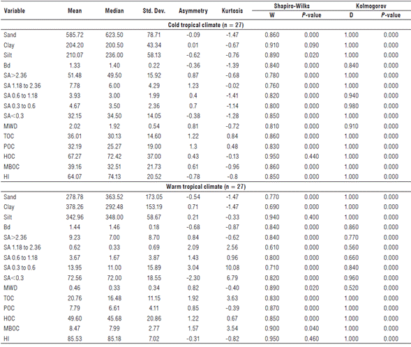 The results were analyzed concerning the compliance of the normality statistic assumptions and the variance homogeneity, by the Shapiro-Wilk and Kolmorogov tests. When assumptions were not accomplished, the Kruskal-Wallis not parametric variance test was used to determine the statistical differences with a reliability degree of 95% and to know the effect of factors such as climate, soil use, and depth.