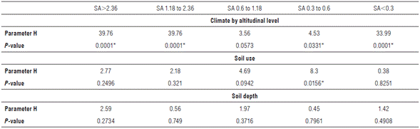 Table 2 shows that the structural stability measured by the SA proportions of size classes presents a response with significant statistical effect due to the climate in 4 of the 5 size classes of SA. The class without significant effect in SA is between 0.60 to 1.18 mm. It is deduced that this effect matches the condition of higher SOC content in soils of cold climate.