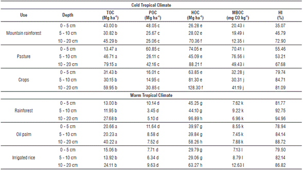 Results of the HOC revealed significant statistical differences by the effects of the climate and depth, without differences found for the soil use system. Since HOC is higher in a cold climate according to the depth it is higher in the deepest layer (10 to 20 cm) and lower in the surface (0 to 5 and 5 to 10 cm).