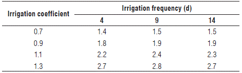 Table 1 shows the amount of water applied during the treatment phase to the cape gooseberry plants. The plants that received the most water corresponded to the treatment of 1.3 with an irrigation frequency of 9 d, while the lower application of water corresponded to the irrigation frequency of 4 d with a coefficient of 0.7. The daily water consumption varied from 1.4 to 2.8 L/plant-d (Tab. 2) for the treatments with an irrigation frequency of 4 d with a coefficient of 0.7 and an irrigation frequency of 9 d with a coefficient of 1.3, respectively, which reflects the fact that the variation in the irrigation regimes used reached 100%.