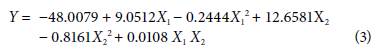 Equation 3 defines the fitted model, with the regression coefficients shown in Table 5. This quadratic model contains two linear terms, two quadratic terms and one factorial interaction.