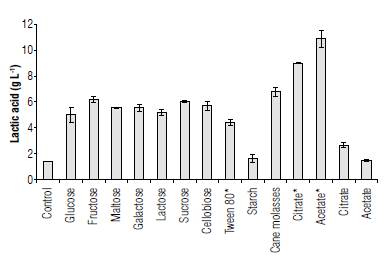 FIGURE 1 Effect of carbon sources on the lactic acid production by Lactobacillus Plantarum strain Hui1. *Supplemented with 12 g L-1 of glucose. Error bars represent the standard deviation from the mean (n = 3).