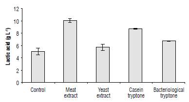 The meat extract shows a higher concentration of vitamins, salts and approximately 57.83% of proteins in its composition. On the other hand, tryptone contains a variety of essential amino acids with 13% of total nitrogen content in its composition. High nitrogen content allows a better growth of bacteria and, as a result, a greater production of lactic acid (Abedi & Hashemi, 2020).