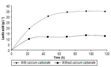 FIGURE 3 Effect of calcium carbonate on the lactic acid production from Lactobacillus plantarum Huil.
