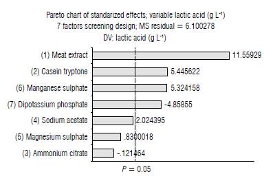 In this experiment, the concentrations of sugar cane molasses and calcium carbonate were kept constant at 140 and 15 g L-1, respectively. Seven factors selected from the one-factor-a-time assays were tested, including meat extract and casein tryptone as nitrogen sources, ammonium citrate and sodium acetate as carbon sources, and Mg2+ (magnesium sulphate), Mn2+ (manganese sulphate) and K1+ (dipotassium phosphate) as ions. According to the ANOVA and the Pareto chart from the Plackett-Burman design (Tab. 3 and Fig. 4, respectively), the meat extract, casein tryptone, dipotassium phosphate, and manganese sulphate significantly influenced the lactic acid production (P<0.05). Both the meat extract and casein tryptone were important components in the culture medium due to their high concentration of peptides, amino acids, and vitamins. Therefore, as sugar cane molasses has a low organic nitrogen content, the concentrations of meat extract and casein tryptone used can be increased to improve lactic acid yields and the growth of Lactobacillus plantarum in a medium containing sugar cane molasses (Lino et al., 2018; Papizadeh et al., 2020).
