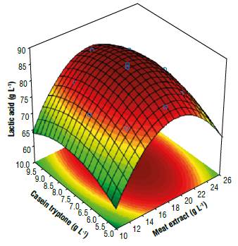 The graph of the response surface model (Fig. 5) showed that concentrations around 18 g L-1 of meat extract and 8 g L-1 of casein tryptone produced 86.23 g L-1 of lactic acid. Concentrations higher than 22 g L-1 of meat extract and 10 g L-1 of casein tryptone showed a reduction in the lactic acid production, demonstrating that nitrogen concentrations higher than 20 g L-1 were toxic for this Lactobacillus plantarum strain.