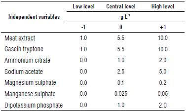 The four significant factors from the one-factor-at-a-time study, as well as the effect of ions, including Mg2+, Mn2+ and K1+ (magnesium sulphate, manganese sulphate and dipotassium phosphate) were analyzed through a Plackett-Burman design that was divided into two levels with two central points and a replicate (Tab. 1). Cultures were carried out in 25 ml flasks containing 20 ml of medium supplemented with 140 g L-1 of sugar cane molasses and 15 g L-1 of calcium carbonate (Chauhan et al., 2007; Coelho et al., 2011). The pH of the medium was adjusted to 6.5 and the cultures were incubated at 37°C for 5 d and 50 g. Data obtained were analyzed by using the Statistica® 10 software.