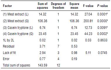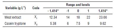 The two significant factors from the Placket-Burman design, the meat extract and the casein tryptone, were optimized by applying the central composite design (CCD) methodology at five levels, including five replicates for the central point (Tab. 2). A total of13 experiments were carried out in 25 ml flasks containing 20 ml of medium with the following composition (in g L-1): sugar cane molasses, 140; calcium carbonate, 15; dipotassium phosphate, 1; manganese sulphate, 0.03; sodium acetate, 5; and magnesium sulphate, 0.1. The medium was adjusted to a pH of 6.5, and the cultures were incubated at 37°C, for 5 d and 50 g. The model is represented by the quadratic Equation 1: