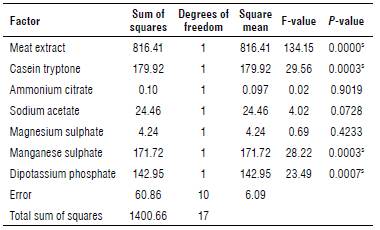 TABLE 3 Analysis of variance (ANOVA) of the Plackett-Burman design for the lactic acid production by the Lactobacillus plantarum strain Huil.