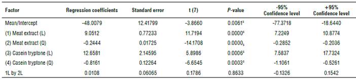 where Y is the predicted lactic acid response in g L-1, (β 0 is the intercept, (βii is the interaction coefficient, and the independent variables correspond to Xi and XiXj. According to Table 2, Xi corresponds to X1 (meat extract in g L-1) and X, corresponds to X2 (tryptone in g L-1).