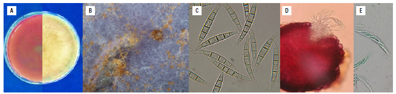 FIGURE 2 Morphological characteristics of Fusarium graminearum isolate 26B (in the Fusarium graminearum species complex FGSC), isolated from co rn plants with stalk rot. A) Characteristics of the colonies, right: appearance of the colony and left: pigmentation on the back of the Petri dish on PDA medium 15 d after culture, B) brown sporodochia on CLA medium, C) macroconidia on CLA medium, slightly swollen in the middle, with five or six septa, moderately curved, with the ventral side straight and the dorsal side arched. The basal cell was foot-shaped, and the apical cell straight with a narrow hook or beak, D) In situ perithecia on CLA medium, E) asci and ascospores. PDA - Potato Dextrose Agar; CLA - Carnation Leaf Agar.
