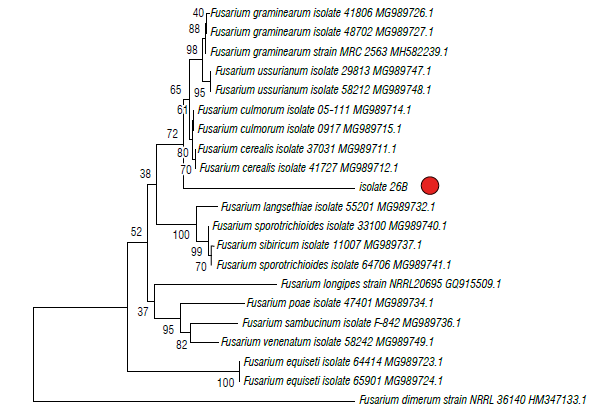 FIGURE 4 Phylogenetic tree of fungal Isolates 26B obtained from corn plants with stalk rot symptoms and obtained by the Elongation factor 1-α (EF1). The evolutionary history was Inferred using the neighbor-joining method. The percentage of replicate trees in which the associated taxa clustered together in the bootstrap test (1000 replicates) Is shown next to the branches. The tree is drawn to scale, with branch lengths in the same units as those of the evolutionary distances used (0.05) to Infer the phylogenetic tree. The evolutionary distances were computed using the Tamura 3-parameter method and are in the units of the number of base substitutions per site. The rate variation among sites was modeled with a gamma distribution (shape parameter=3).