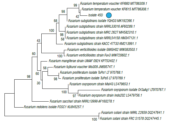 FIGURE 5 Phylogenetic tree of fungal isolates 45D obtained from corn plants with stalk rot symptoms and obtained by the Elongation factor 1-α (EF1). The evolutionary history was inferred using the neighbor-joining method. The percentage of replicate trees in which the associated taxa clustered together in the bootstrap test (1000 replicates) Is shown next to the branches. The tree is drawn to scale, with branch lengths in the same units as those of the evolutionary distances (0.05) used to Infer the phylogenetic tree. The evolutionary distances were computed using the Tamura 3-parameter method and are in the units of the number of base substitutions per site. The rate variation among sites was modeled with a gamma distribution (shape parameter=3).