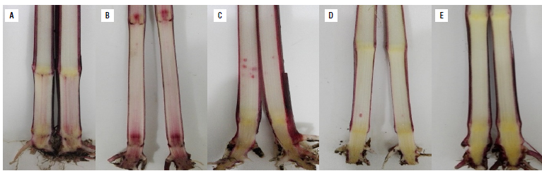 Isolates 26B of F. graminearum and 45D of F. subglutinans were pathogenic in corn plants of the regional variety Simijaca. At 90 d after sowing (DAS), the inoculated plants showed necrosis and reddish to purple colorations in the basal internal part of the stalk (Fig. 6). Incidence of internal symptoms was observed in 40% of the plants inoculated with F. graminearum and 25% of plants inoculated with F. subglutinans, whereas these symptoms were observed in 20% of plants inoculated with both species. Fusarium graminearum showed a tendency to be located mainly in plant nodes (Fig. 6B), whereas F. subglutinans was located in the internodes (Fig. 6C). Necrosis of nodes and internodes occurred with the inoculation of the combination of both Fusarium species (Fig. 6A). The thermal control did not show symptoms (Fig. 6E), and absolute control showed a low degree of affectation (Fig. 6D). From their respective treatment, F. subglutinans and F. graminearum were isolated on PDA medium and morphologically identified fulfilling Koch postulates. Fusarium was not isolated from the thermal control.