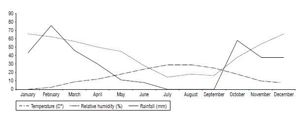 FIGURE 1 The average monthly temperature, relative air humidity, and rainfall of the region in 2014 (IMO, 2014).